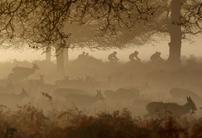 Deer graze as cyclists pass in the early morning mist at Richmond Park.